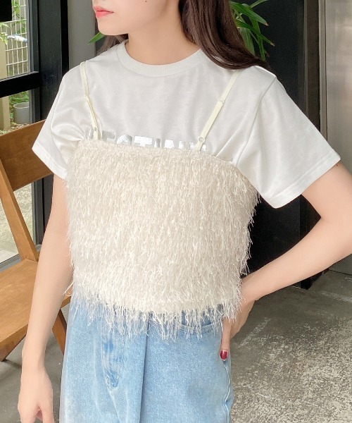 2024 SS 春夏アイテム 【ふわふわのフェザーがいつものコーデをワンランク上げてくれるアイテムに】 ▼Design フェザーのふんわりとした質感が柔らかく女性らしい雰囲気に◎ 見た目はボリュームがありますが薄手の素材なので着やすい1着。 いつものコーデにプラスワンするだけでパッと目を惹く主役級アイテム♡ コンパクトなクロップド丈で体にフィットするサイズ感をご用意しました◎ ▼Styling 短めの丈感で、Tシャツワンピやシャツワンピなど丈の長いインナーと合わせてもスタイル良く見せてくれます。 軽さも魅力的でストレスフリーで重ね着が楽しめます◎ 存在感のある大きめの編地なのでシンプルなインナーはもちろん、ロゴやカラーなどアクセントになるアイテム合わせも◎ 大人っぽくきまるワイドパンツを合わせたり、シャツやワンピースの上から重ねるのも。 ボリュームスリーブなどをインナーに取り入れるとフェミニンな印象が高まります。 ・肩紐調整可【以下クロ参考。カラーにより多少の誤差あり】・透け感:透けない・伸縮性:なし・生地の厚さ:普通・裏地:あり モデル着用のインナーは別売りとなります。 (キャミソール単品の販売です) ▼Recommend ・キャミビスチェ ・フェザー ・レイヤード ・ショート丈 ・重ね着 ・大人カジュアル ・フェミニン ・オールシーズン