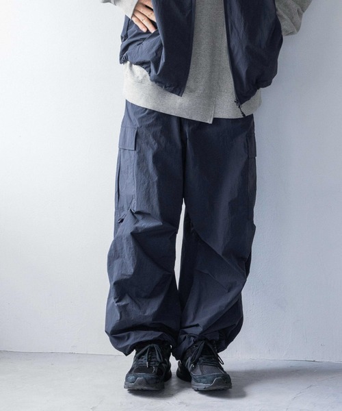 ■素材■ タスラン糸を使用したナイロンウェザー生地にワッシャー加工を施して、柔らかで表面感のある、着やすい素材感に仕上げています。 ■デザイン■ USM-65カーゴをベースにしたパンツになります。 ゆったりとしたオーバーサイズシルエットはそのままに、腰回りのフィットを改善させました。 裾のドローコードを絞ることで、立体的なシルエットで着用することも出来ます。 ■スタイリング■ ナイロンドローコードベス ト134336とセットアイテムで着用可能です。