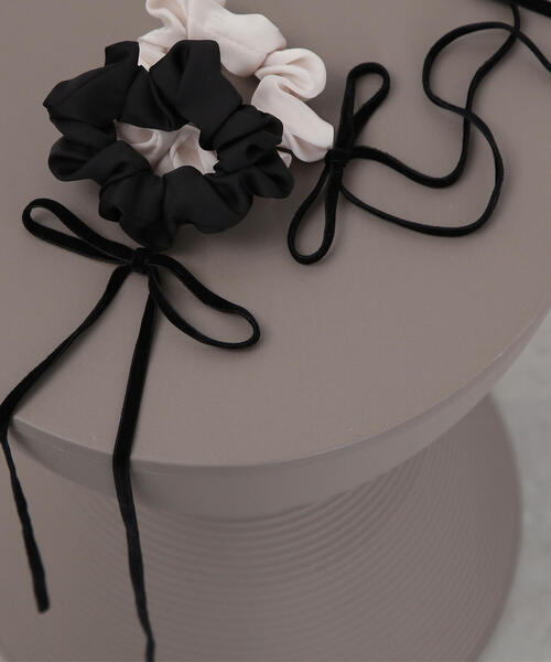 ベルベットのナローリボンがポイントのシュシュ。長く伸びたナローリボンがアップスタイルのポイントになります。時短でヘアアレンジが完成するヘアアクセサリーです。 ※モデルの着用画像の場合、光の当たり具合により、実際の色味と異なって見えることがございます。色味は、商品単体の画像をご参照ください。