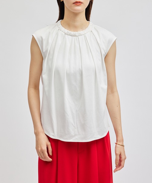 【素材】 繊維長が長く肌触りの良いインド綿を使用。シルケット加工をすることでハリ感とナチュラルな光沢感を出し、バイオ加工することで表面の毛羽を極力カットすることでクリーンな表面感に仕上げています。 【デザイン・シルエット】 ネック回りにギャザーとタックを入れることで、ボディのシルエットはゆったりと肌離れさせ、フレンチスリーブで気になる二の腕ラインをカバーしています。 ネックのシルキーなサテン切り替えで、同色使いですが、素材でのコントラストをつけてエレガントな印象に仕上げました。 【カラー】 ベーシックでスタイリングしやすいモノトーンの2カラー展開 【おすすめのスタイリング】 ワイドパンツにインしたスタイルなどのオフィススタイルをエレガントな印象に仕上げてくれる、ブラウスライクに使えるカットソーです。 ---------------------------- 透け感:なし 裏地:なし 伸縮性:ややあり 光沢感:ネック部分のみあり 生地の厚さ:薄手 ポケット:なし 開き方:かぶり ---------------------------- 【モデル情報】 モデル身長:168cm 着用サイズ:F ※画像の商品はサンプルです。実際の商品と仕様、加工、サイズが異なる場合がございます。 ※撮影場所やライティング、お使いのモニター環境によって色の見え方が異なる場合がございます。 ※商品のカラーは画像の色味をご参照ください。動画は仕様説明のため、色味が実物と異なる場合がございます。