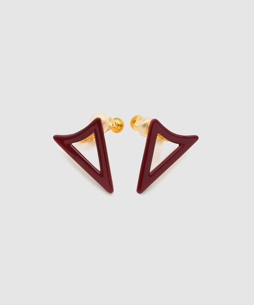 【素材】 メタルにゴールドプレーティング加工を施しています。ネジバネ式イヤリング使用。 (レッドのみトップパーツにエナメル塗装加工) 【デザイン・シルエット】 「Suprematism(シュプレマティズム)」のテーマより、ROPEアナグラムモチーフを分解して再構築したパーツを散りばめたシリーズ。 アナグラムモチーフから抽出したトライアングルパーツをトップモチーフに使用したアイテム。すっきりとした線でシャープな印象に仕上げました。 【カラー】 落ち着いたゴールドカラー、レッドエナメルのポイントカラー、2色展開 ※画像の商品はサンプルです。実際の商品と仕様、加工、サイズが異なる場合がございます。 ※撮影場所やライティング、お使いのモニター環境によって色の見え方が異なる場合がございます。 ※商品のカラーは画像の色味をご参照ください。動画は仕様説明のため、色味が実物と異なる場合がございます。