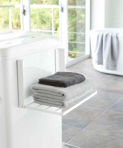 マグネットでピタッと洗濯機にくっつく!簡易ラック 一時置きスペースを作れる お風呂の脱衣所・洗濯機周りに簡単に取り付けができるラック。棚やラックなどの収納スペースが少ない脱衣所で困る、お風呂上がりのタオルの置き場所。 洗濯機横に棚を取り付けることで、湯上りにすぐタオルを手に取って体を拭くことができます。 耐荷重は約1.5kgなので、入浴後の着替えやお子さまのパジャマなどもまとめて置けて便利。 マグネットで簡単取り付け 磁石が付く洗濯機にマグネットで貼り付けるだけの簡単設置。 強力マグネットでしっかりと取り付けることができ、位置の調整がしやすいのも嬉しいポイントです。 曲面にも取り付けられる マグネット部分は可動するので、正面がカーブした洗濯機にも取り付け可能。 正面と側面のどちらでも設置でき、洗濯機を買い替えてもそのまま使えるのが◎。 折り畳みで省スペースを有効活用 使わないときは畳んで、省スペースに収納できるのが魅力。 使いたいときだけサッと引き出せるので、狭い洗面所でも設置しやすく、洗濯物を取り出すときなども動線を邪魔しない嬉しいデザインです。 収納時もしっかり固定 棚を畳んで収納するときは、上部のマグネットでしっかり固定ができます。 棚をしまうと、奥行きはわずか4cmなので、使わないときも場所を取らず気になりません。 サイズ 約 幅 410mm×奥行き 270mm×高さ 255mm 収納時:約 幅 410mm×奥行き 40mm×高さ 255mm 棚内寸:約 幅 395mm×奥行き 215mm 【重さ】 約 1.2kg 【耐荷重】 約 1.5kg 【メーカー品番】 5096 / 5097 【tower/タワー】 60年を超える歴史のあるインテリア雑貨の専門メーカー山崎実業から誕生。アイロン台、かさ立て、収納用品を中心に暮らしを彩るインテリア雑貨を多数展開。