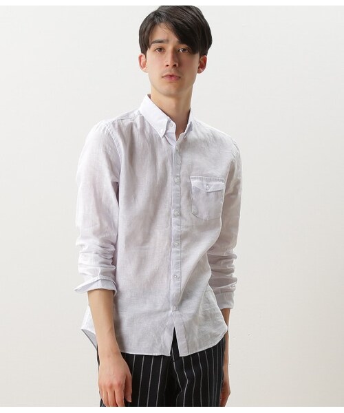 素材から開発したコットンリネンのブロードを使ったボタンダウンシャツ。程よいハリとコシがありながらも、リネン混ならではの軽く清涼感のある風合いが特徴的。クールな男らしさを引き立てる一枚です。