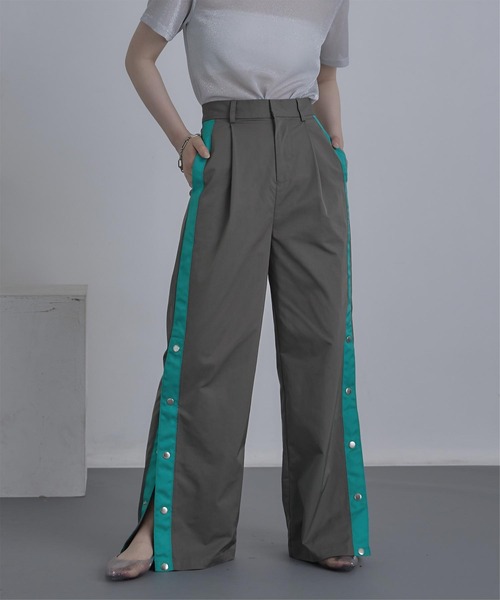 ・程良い厚みとハリ感のある高見え素材を使用。・脚のラインを拾わないワイドシルエット。・サイドラインデザインがトレンド感もプラス。・裾がドットボタンで開く仕様で、シルエットの変化も楽しめる1枚。※当商品は機械による生産の過程上、どうしても"生地を織る際の糸の継ぎ目"や多少の"ほつれ"、他繊維の"混紡"、また、形やサイズや柄に多少の"誤差"が生じる場合がございます。※サイズは、実寸サイズを測っているため多少誤差がでる場合があります。製造工程の関係上、各採寸箇所実寸(平置き)より【約-3cm~+3cm】程度は誤差の許容範囲とさせて頂いておりますので、予めご了承くださいませ。※メーカーより密封状態で入庫し、検品時に再度袋詰めを行っておりますが、素材により染料等の臭いが強い場合がございます。※発送上の状態によって商品がシワになる場合がございます。※商品により色落ち・色移りがある場合がございますので、品質表示をご確認の上、お取り扱いにご注意くださいませ。【伸縮性】多少あり【透け感】なし