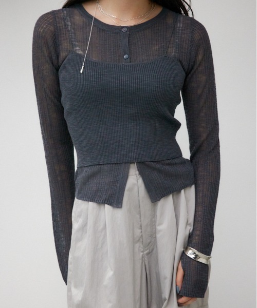 ■商品(デザイン)ポイント:シアーリブカーデとニットキャミのセットアイテム。 ■商品ディティール:表面感のあるリブで編み立てたカーデは 、程よい透けとコンパクトなサイズ感がポイント。 長めの袖丈にサムホールを付けて抜け感を出しました。キャミはシンプルなデザインにしており、細目の肩紐で華奢な雰囲気に仕上げました。 キャミをカーデのインナーとして着用したり、カーデの上にキャミを重ねてレイヤードしたりと様々な着こなしをお楽しみ頂けます。 ■スタイリング:レディライクなアイテムなので、デニムやワイドレッグのパンツなどカジュアルボトムとの合わせがおすすめ。 カーデの上にキャミを重ねたレイヤードスタイルも今年らしくおすすめです。 ■素 材:表面感のあるリブ編みのシアーニット ■透け感:カーディガン:あり キャミソール:なし ■光沢感:なし ■伸縮性:あり ■裏 地:なし[お気に入り登録のおすすめ]■商品のお気に入り登録お気に入りアイテムの再入荷・在庫1点などの通知を受け取ることができます。■ブランドのお気に入り登録新作アイテムの入荷や人気アイテムの再入荷、おすすめトピックスなど、いち早くブランドの情報を受け取ることができます。[注意事項]※弊社管理上のカラーを表記しており、タグのカラー表記と異なる記載となっている場合がございます。※商品画像の色味は、屋外や屋内の光の照射や角度により実物と色味が異なる場合がございます。※着用、お取り扱いの際は、アテンションタグをご確認ください。AUTUMN & WINTER ( 秋服 / 冬服 )