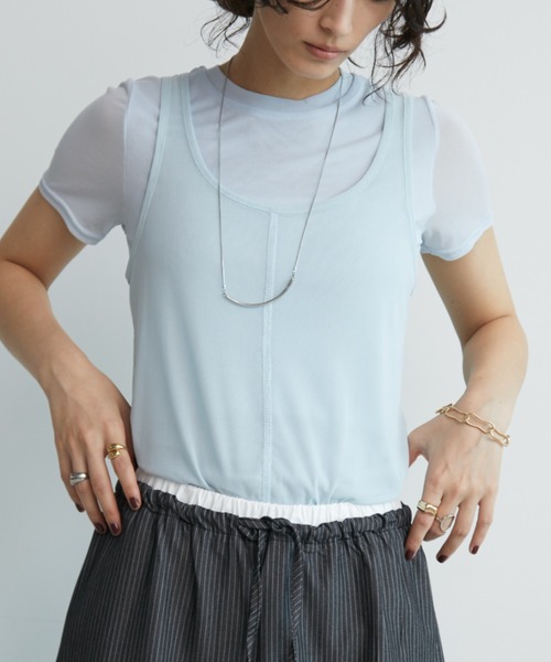 デコルテラインをヘルシーに見せてくれるチュール素材の大人タンクトップ■デザインカジュアル過ぎず、程よくレディ感のあるチュールメッシュ素材のタンクトップが登場。普段のコーディネートに取り入れるだけでワンランク上の着こなしが楽しめるタンクトップ。フロントのセンターシームのデザインを取り入れてシンプルながらも遊び心あるデザインに仕上げました。羽織りのシャツやカーデのインナーとしても活躍。これからの季節はタートルニットとの相性抜群!レイヤードアイテムとして重宝すること間違いなし。前後2WAYで着用できるのも嬉しいポイント。丈感はアウトしてもインしても良い汎用性のあるバランスに仕上げています。モダンで大人な雰囲気のブラックとブラウンフェミニンなホワイト、ヘルシーな水色の4色展開です。色違いで欲しくなる色展開です。■素材感人気のチュールメッシュ素材を使用。柔らかくて軽量でしわになりにくい!乾くのも早いのも嬉しいポイント。■スタイリングいつものコーデにプラスワンするだけでOK!カットソーに合わせるとカジュアルにフェミニンさが加えられたお洒落スタイリングに。シャツなどのインナーはもちろんベスト感覚で上から合わせると上級者コーデに。色んな着方を楽しめる一着です。-----------------------透け感/あり光沢感/なし伸縮性/あり裏 地/なし厚 み/薄め-----------------------※自宅洗濯可能(単独手洗い)※洗濯の際はネットに入れて行うのを推奨しておりいます。※濃色品は、摩擦などにより他の衣類に色が移ることがありますのでご注意ください。※繊細な生地を使用しておりますのでアクセサリーや凹凸のある壁などへのひっかかりにご注意ください。※詳しいお手入れ方法は商品タグをご参照ください。【SNS掲載情報】@auntmaries.official公式Instagramアカウントにて新作情報をはじめ多彩なコンテンツを掲載しております。ぜひご覧くださいませ。【商品のお気に入り登録】完売カラーの再入荷通知やラスト1点の通知プライスダウンの通知も受け取ることができます。ぜひご登録ください◎【ブランドのお気に入り登録】新商品や再入荷など、ブランドの情報をいち早くお知らせします!ぜひご登録ください◎※ご注意※・屋外の光や照明の当たり具合で、実際の商品の色味とカラー別画像の色味に若干の違いが発生する場合がございます。・詳細画像と併せてご確認の上、ご注文いただきますようお願い致します。