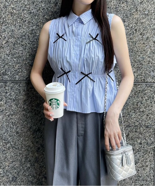 デザイン性のある!リボン付きノースリーブブラウス【デザイン】夏らしいストライプ生地のノースリーブブラウスです。身頃にリボンがついているところがトレンドポイントです!ウエスト部分にはゴムが通っているため、スタイルアップ効果があります♪【素材感】着心地の軽いポリエステル素材伸縮性:なし/ 透け感:若干あり/ 裏地:なし手洗いによる洗濯可 / ドライ・ウェットクリーニング可【コーディネート】デニムパンツとの相性も抜群で夏らしいコーデに仕上がります♪サンダルやキャップと合わせてコーデをお楽しみいただけます◎【※お取り扱い上のご注意】1:モニター環境等により実際の商品と多少色味が異なって表示される場合がございます。予めご了承下さい。2:屋外で撮影された商品は、天候により多少実際のカラーと異なる場合があります。商品のカラーはトルソー(マネキン)の商品画像をご参照ください。3:濃い色の商品は、お洗濯や摩擦等による移染にご注意ください。4:末永くご愛用頂く為に、アテンションタグ・洗濯ネームを必ずご確認の上、着用又はお取り扱い下さい。5:生産時期により、色、サイズ、デザイン、素材の質感が多少が異なる場合がございます。あらかじめ御了承下さいませ。