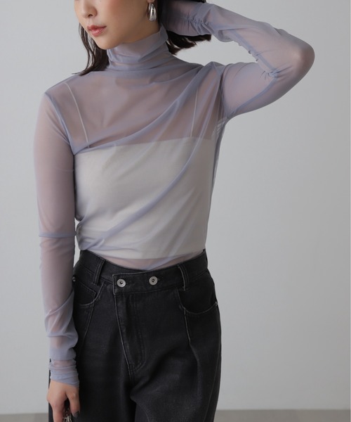 【NEW COLOR】着回し力抜群のシアーカットソーに新色[ブルー]が登場! 〔fabric&design〕 新色でグレー味がかったライトブルーが追加。 ほんのり素肌を透かせたシアー素材のハイネックトップス。 シンプルな形のハイネックデザインと、程よいスリムシルエットが女性らしい印象です。 〔styling〕 中にお手持ちのインナーを合わせていただき、透け感を楽しむコーディネートに。 ビッグシルエットのトップスインにも、首元が開いたワンピースのレイヤードにもお勧めです。 ■透け感:あり ■生地の厚さ:薄手 ■裏地:なし ■伸縮性:あり ■光沢:なし ■シルエット:スタンダード --------------------------------------------------- ◆商品のお気に入り登録◆ お気に入りアイテムの値下げ・再入荷・在庫1点などの通知を受け取ることができます。 ◆ブランドのお気に入り登録◆ 新商品や再入荷、セール、クーポン配布などお得な情報を受け取ることができます。 ---------------------------------------------------