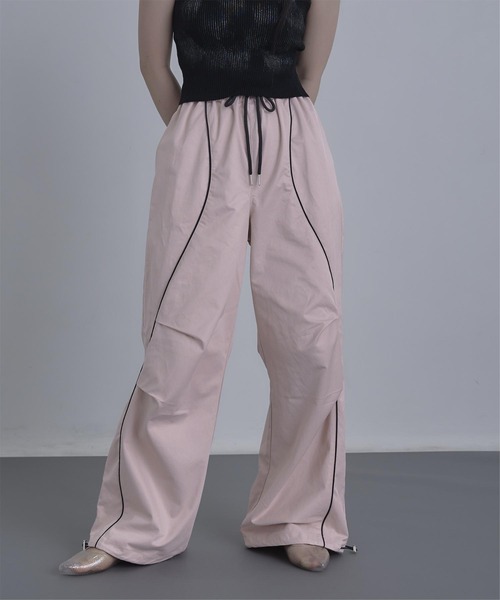 ・カーブ切替がポイントのトラックパンツ。 ・ワイドシルエットで身体のラインを拾わないので体型カバー効果も◎ ・ウエストゴム仕様で紐で調節可能です。 ・裾のドロストを絞ってシルエットの変化を楽しめる1枚。 ※当商品は機械による生産の過程上、どうしても"生地を織る際の糸の継ぎ目"や多少の"ほつれ"、他繊維の"混紡"、また、形やサイズや柄に多少の"誤差"が生じる場合がございます。 ※サイズは、実寸サイズを測っているため多少誤差がでる場合があります。製造工程の関係上、各採寸箇所実寸(平置き)より【約-3cm~+3cm】程度は誤差の許容範囲とさせて頂いておりますので、予めご了承くださいませ。 ※メーカーより密封状態で入庫し、検品時に再度袋詰めを行っておりますが、素材により染料等の臭いが強い場合がございます。 ※発送上の状態によって商品がシワになる場合がございます。 ※商品により色落ち・色移りがある場合がございますので、品質表示をご確認の上、お取り扱いにご注意くださいませ。 【伸縮性】ウエスト部分にあり 【透け感】なし