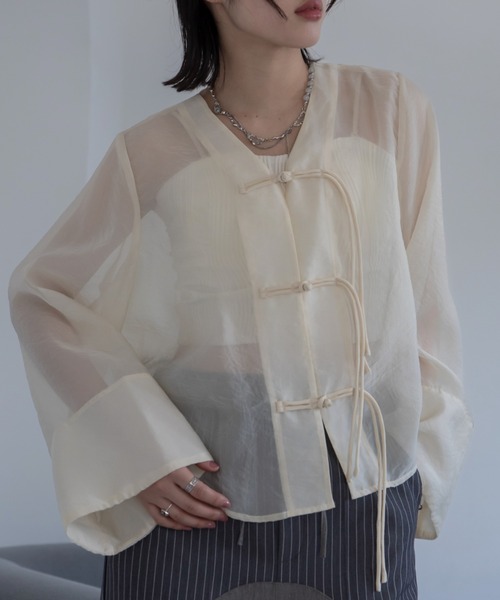 - 2025 VACANCY SPRING COLLECTION -チャイナ風のボタンデザインが目を惹くシアーシャツ◆FABRICシャツ感覚でサラッと羽織りやすい軽いシアー生地を使用。フロントのボタンはチャイナ風にしており可愛らしく、紐の束に引っ掛ける仕様です。紐が垂れているシルエットもモードライクで素敵です。程よくゆったりとしたサイズ感でストレスフリー。袖のワイドシルエットがアクセントになりスタイルUPに◎カラーは、定番で合わせやすいイエロー寄りのWHITEシックでモードライクなBLACKの2色展開です。◆STYLEデザイン性も高い為、シャツとして1枚でももちろんキャミソールやタンクと合わせて羽織としてもオススメ。裾はシャツテールデザインの為、ボトムスは様々なシルエットに合わせやすくデニムやワイドパンツと合わせてトレンドライクなスタイルやロングスカートと合わせてレディライクなスタイルなど幅広いジャンルに活躍してくれます!・・・・・・・・・・・・・・・・・・・・透け感:あり裏地:なし伸縮性:なし光沢感:なし生地の厚さ:薄い・・・・・・・・・・・・・・・・・・・・【お買い物をお楽しみいただく為に】▼お気に入り登録をオススメ致します▼♡をクリックして下さい。・《商品のお気に入り登録》で再入荷通知や、ラスト1点の通知、セールの際の通知も受け取ることができます。・《ブランドのお気に入り登録》で新作商品や再入荷など、お得な情報を受け取ることができます!【ATTENTION】 ※画像の商品はサンプルです。実際の商品と色味、仕様、加工、サイズ、素材等が若干異なる場合がございます。※撮影場所やお使いのモニター環境により若干お色味が異なる場合がございます。※製品によっては染料の特性上、湿った状態や汗をかいた状態での長時間の放置、または摩擦により、他のものへ色移りする恐れがありますので、着用時にはご注意下さい。 ※お洗濯については商品の洗濯タグ表記をご確認ください。※風通しがよく、湿気の少ない日の当たらない場所で保管して下さい。 ※また製品加工上、お手元に届く際に匂いが生じる場合がありますが、 ご使用を続けていく事により匂いは軽減されます。