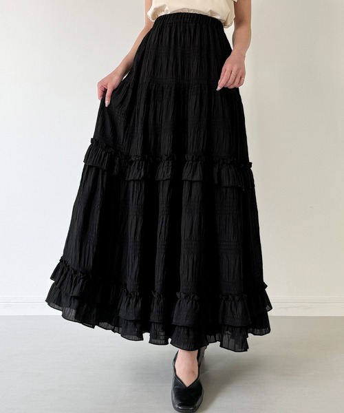 【JUNOAH / ジュノア】 ※フレア分量が多いため到着時畳みシワが付きやすい商品となっております。予めご了承の上ご検討ください。 ふんわり愛され女子になれる!シアーティアードフリルスカート。 ■detail ふわっと揺れ動くティアードシルエットで 思わずくるっとしたくなるような、あどけなさ漂う一枚。 フリルデザインで甘さをプラスし、女の子らしさ溢れる仕上がりにしました♡ また、足元のフリルはほんのり透け感があって抜け感のある印象に。 ウエストは一周ゴムで楽ちんなのに、360°可愛らしくキマる優秀アイテムです! ※ウエスト一周ゴム入り ■fabric くしゅっとしたリンクルの表情感が可愛らしく、ソフトタッチなポリエステル素材を使用しております。 ………………… 透け感:なし 厚さ:普通 伸縮性:なし 裏地:あり シワ:なりにくい 推奨シーズン:3月~10月 ※関東の平均気温を目安に推奨シーズンを記載しております。 ………………… ※詳しいお手入れ方法は商品タグをご参照ください。 【※必ずご確認の上、ご検討ください※】 ※通販の特性上、到着時には畳みシワが必ずございますのでご了承ください。 ※当ブランドではデザイナーの感性を大切にし、デザイン性を重視した商品を提案しております。 画一的な商品ではなく、最新の生地や仕様で個性に焦点を合わせて展開いたしますのでお気軽にお試しください。 ※返品・交換規定は当サイトのヘルプをご参照ください。 ★お買いものをよりお楽しみいただく為に!★ ▼商品のお気に入り登録 お気に入りアイテムの完売カラーの再入荷通知や、ラスト1点の通知、 セールの通知も受け取ることができます。 ▼ブランドのお気に入り登録 新商品や再入荷など、クーポン配布などのお得な情報を受け取ることができます。 ※商品画像は撮影時の光や角度により、実物の色味と異なって見える場合がございます。 ※撮影はサンプル品を使用しており、表示のサイズ感も実物とは若干異なる場合もございますので、 予めご了承ください。 ※生産時期により色・素材・サイズ感など多少異なる場合がございます。予めご了承ください。
