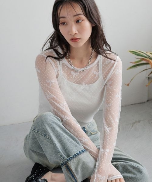 ■デザイン■リボン柄の繊細なチュール素材を使用した今年らしいレースインナー。適度なフィット感で1枚でもインナーとしても使いやすくなっています。■スタイリング■1枚での着用はもちろん、今年はTシャツを上から着用し袖のレイヤードを楽しむ着こなしがオススメ。寒い時期はニットやスウェットからちらりとリボン柄を見せるスタイリングも。1枚あると重宝するレースインナーです。