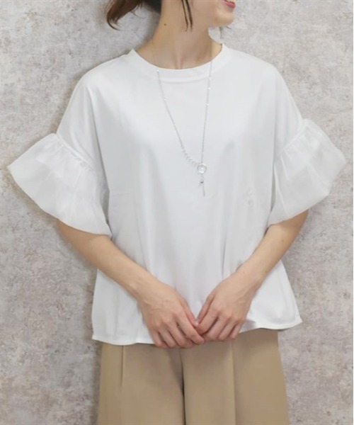 【アイテム説明】キラキラしたラメ糸混の楊柳生地との袖切替がポイントのカットプルオーバーです。さらっとしたシルケット素材は肌触りも良く、着心地の良さが◎。カジュアル過ぎないキレイな張り感もポイントの夏に着やすいアイテムです。【デザイン】切替のラメ楊柳はふわっとしたバルーン袖デザインがポイント。ワンポイントのビジューがキラッと光るロングネックレスもセットです。【コーディネート】カジュアルコーデにピッタリのアイテムで、ロングスカートやワイドパンツ等、ボトムスを選ばない便利なアイテムです。インスタイルでもアウトスタイルでも、スッキリしたシルエットで着られます。▽ axes femme * アクシーズファム【Concept】axes femmeのお洋服であなたのライフスタイルにほんの少しだけ彩る花が咲きますように。ブランドを通して、彩る花たちが、人と人、お客様や作り手たちの想いが世界中に繋がっていきますように。ベル・エポック(フランスの古き良き時代)にパリジェンヌたちが愛したファッションや文化にルーツをおき、独自のフェミニンスタイルを楽しむブランド**********************.。.:? お気に入り登録のおすすめ ?:.。.∇気になるアイテムを登録∇ハートをクリックしてお気に入りに登録すると完売カラーの再入荷やラスト1点の通知、セールの通知を受けとることができます。∇ブランドを登録∇新商品や再入荷、セール通知など、いち早くブランドの情報を受けとることができます。是非ご利用頂き、お買い物をお楽しみ下さい。.。.:? 商品について ?:.。.・サイト上のカラー名と、お届け商品に記載されているカラー名が異なる場合がございます。・商品の色味は、撮影場所や光のあたり具合、お客様のお使いのPCのモニター環境などにより色味が違って見える場合がございます。予めご了承の上ご注文下さい。.。.:? 返品・キャンセルについて ?:.。.・着用、洗濯後の返品は致かねます。・商品到着後、着用前に商品を確認して頂きますようお願い致します。