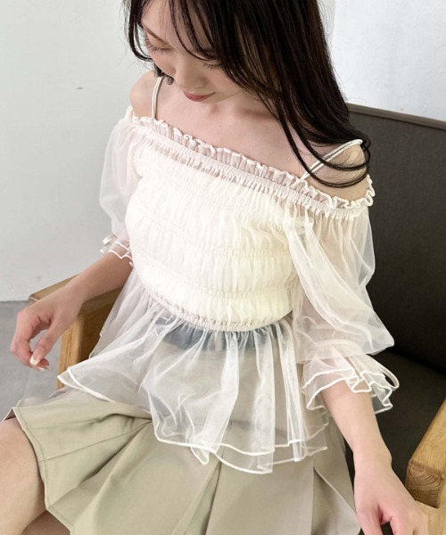 ■バズりブラウスが夏仕様に!■ 春に大人気だったオフショルブラウスが夏ver.で登場! 一枚で着映えるトップスです。 柔らかいチュールを重ねているためふんわりとしたボリュームが◎ また重ねることによって程良い透け感で着用頂けます。 身頃のシャーリングは太めになっているのでスッキリとしたシルエットに。 首元のゴムは柔らかいのでオフショルにしても上がってきにくい仕様です。 パンツでカジュアルダウンした合わせがおススメです。 ーーーーーーーーーーーーーーー 透け感:あり 裏地:なし 伸縮性:あり 光沢感:微光沢 生地厚さ:普通 洗濯方法:洗濯可 ※詳しいお手入れ方法は商品についているタグをご覧ください ーーーーーーーーーーーーーーー ※ご利用のモニター環境により、実際の色味と多少異なる場合がございます。 … information … 欲しいitemをお気に入り登録(♡マークをclick) ・お買いのがし対策…完売itemの再入荷やラスト1点の情報をお知らせ ・欲しいitemをお得にget…price downになったらいち早くお知らせ ・スムーズ検索…ZOZOのお気に入りアイテムページで簡単checkできるから、再検索不要♪