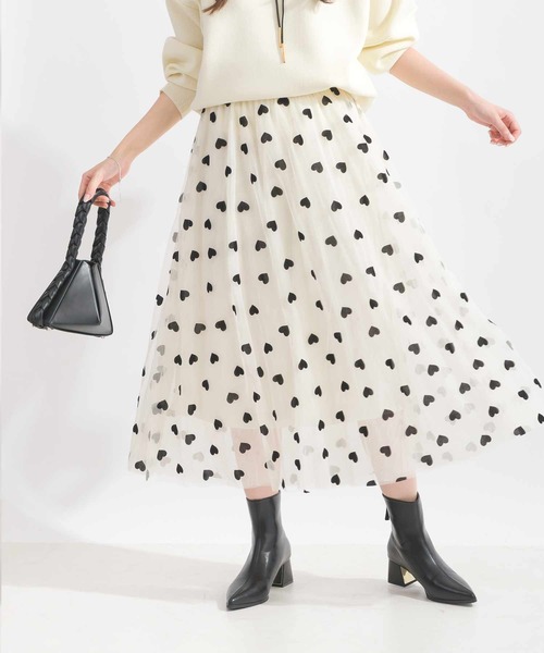 フロッキー加工の立体感あるハート柄が可愛いスカート。 軽量でソフトな肌触りの生地感。 無地とハート柄の二枚重ねのチュールが華やか。 適度なボリュームで広がりすぎず美シルエットな1枚。 ウエストはゴムなのでお腹回りを締め付けずストレスフリーな履き心地。 柔らかくエアリーなチュールがフェミニン感たっぷりで ロマンチックなコーデにもおすすめです。 シンプルなTシャツやカットソーと合わせても 華やかでトレンド感のあるコーデが叶います。 ※ウエストゴム 【詳細情報】 厚み:□薄手 ■ふつう □厚手 透け感: ■なし □あり(裾部分あり) 光沢感: ■なし □あり 伸縮性: ■なし □あり 裏地: □なし ■あり ポケット:■なし □あり 重量: 約260g ※撮影場所や明るさにより 実際の商品と色味が若干異なる場合がございます。 ☆商品のお気に入り♡登録を押せば ”再入荷通知”や”残りわずか通知” 値下げのお知らせが届きます! お気に入りのブランド登録していただければ新商品入荷のお知らせも届きますので 是非登録してみて下さい