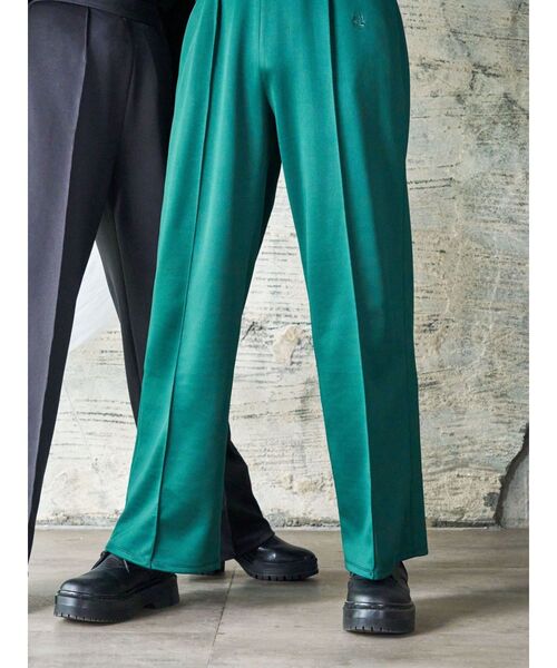 【unisex item】 さらっとしたストレッチ素材を使用し、ウエストの後ろ側のみゴムが入っているので着心地良く、見た目も◎ 着脱用のジップ付きでウエストをスッキリと見せながら、センターのピンタックが美脚効果を促します。 セットのトップスと同じく、コラボ限定の同色刺繍がポイントです。 セットアップコーデはもちろん、シンプルなのでTシャツとのラフなコーデや、シャツ×ヒール合わせのきれいめコーデもおすすめです。