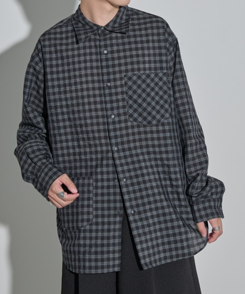 【koji’s direction item】 透け感のあるチェック素材やアシンメトリーなポケットが特徴のシャツ ■ポイント ・アシンメトリーに配置したポケット ・透け感のあるチェック生地 ・着脱のしやすいスナップボタン ・ポケットに手を入れやすい深く入ったスリット ■デザイン/ 素材 一見シンプルなチェック柄に遊び心のあるポケット配置や大きな襟が特徴。 さらりと夏でも着やすい生地感で、紫外線対策や室内の冷房対策としてもおすすめ。 ■スタイリング デニムやスウェットパンツで合わせるカジュアルスタイルはもちろん、スラックスを合わせて綺麗めに仕上げるのもおすすめです。 ワイドストレートのパンツなどに合わせてトレンドの韓国コーデにも。 …………………… 透け感 : あり 厚さ:やや薄め 伸縮性:なし お手入れ方法:手洗い推奨 …………………… ※ご注意※ ・屋外の光や照明の当たり具合で、実際の商品の色味と カラー別画像の色味に若干の違いが発生する場合がございます。 ・詳細画像と併せてご確認の上、ご注文いただきますようお願い致します。 【MERLOT】 ジャンルレス、ジェンダーレスをテーマにヴィンテージライクからモダンなアイテムまで幅広く展開。 メンズとレディース、カジュアルとモード。あらゆる境界を取り払うミックススタイルを提案します。 【商品のお気に入り登録】 完売カラーの再入荷通知やラスト1点の通知、プライスダウンの通知を受け取ることが出来ます。 【ブランドのお気に入り登録】 新商品や再入荷など、嬉しい情報を受け取る事が出来ます。 ぜひご登録ください◎