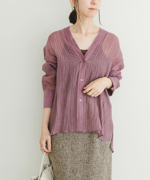 大人ライクな透け感をお楽しみいただけるシアー生地で仕立てたブラウス。Vネックシルエットで抜けのある印象をプラス。1枚での着用はもちろん、軽い羽織りとしても取り入れていただけるアイテムです。ヨウリュウのようにランダムに入ったシワ感が、シンプルながら表情のあるスタイリングにアップデートしてくれますよ。【2024 Autumn/Winter】【24AW】※商品画像は、光の当たり具合やパソコンなどの閲覧環境により、実際の色味と異なって見える場合がございます。予めご了承ください。※商品の色味の目安は、商品単体の画像をご参照ください。---------------《スタッフレビュー》[スタッフA]年齢 : 20代前半, 身長 : 156cm, 体型 : 普通普段の着用サイズ : S,Mパーソナルカラー : ブルベ 夏【着用カラー/サイズ】OFF/FREE【サイズ感】程よくゆとりあるシルエットでサッと羽織りやすかったです。後ろの方が丈が長めになっていて、着丈はお尻が隠れるくらいの丈感でした。【素材感・着心地】程よく透け感があり、凹凸ある素材感のおかげで肌にまとわりつくことなく、快適に着用できました。【その他】昼夜の寒暖差や冷房対策にもピッタリ◎Vネックが首元をスッキリ見せしてくれました。-----------------------------▼お気に入り登録のおすすめ▼お気に入り登録商品は、マイページにて現在の価格情報や在庫状況の確認が可能です。お買い物リストの管理に是非ご利用ください。素材感透け感 : あり伸縮性 : なし裏地 : なし光沢 : なしポケット : なし