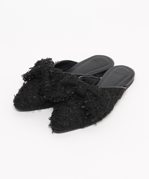 オンオフ使えるフラットシューズ モケモケのフリンジ生地がポイントのフラットミュール。 トレンド感のある大きめのリボンがアクセントになっており、その日の気分で取り外しが可能です。 ローヒールながらも、ポインテッドトゥですっきりと大人っぽい印象に。 さっと履きやすく、きれいめからカジュアルまで幅広いスタイリングに合わせていただけます。 ※屋外の光や照明の当たり具合で、実物と色味が異なって見える場合がございます。詳細画像の色味をご確認ください。