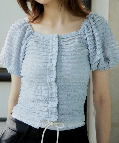 ■POINT:細かいフリルが特徴的なパフスリーブのトップス。■DETAIL:フリルが華奢なので、着用するだけで上品な印象に。フロントボタンでカジュアルさも加えているので、ガーリーすぎず、様々なボトムスと相性抜群です。■STYLING:スカートやスラックス合わせで綺麗めなコーディネートや、半端丈のボトムスやメンズライクなボトムスを合わせるのもおすすめ。■透け感:なし■光沢感:ややあり■伸縮性:なし■裏地:なし※本品は素材の特性上色落ちします。洗濯、クリーニング、着用(使用)時に他の衣類や雑貨、家具類に色移りする事があります。特に汗や雨等で湿った状態では、色落ちが顕著になります。白、淡色との組み合わせは避け、お取り扱いには十分ご注意下さい。生地の編みでフリルを作っています。フリル間の糸はとても繊細で密度も緩いため、爪やアクセサリー等の引っかけ・引っかかりや、1点に強い力がかからないように、お取り扱いには充分にご注意ください ※商品画像はサンプルのため、色味やサイズ、素材の混率等の仕様に変更がある場合がございますので、予めご了承ください。 ※一部予約商品につきましては生産上の都合によりお届け予定日や店頭発売と前後する場合もございます。 ※追加生産商品は、一部の店舗、通販で販売中の場合がございます。予めご了承下さい。【SLY/スライ】「Casual」「Girly」「Mode」をベースに発信する、ディテールへのこだわりが詰まった、どこか必ず女性らしさを感じるアーバンスタイル。 さまざまなエッセンスをミックスした、時代の空気を体現するコレクションを展開。 ▼商品のお気に入り登録 お気に入りアイテムの値下げ・再入荷・在庫1点などの通知を受け取ることができます。 ▼ブランドのお気に入り 登録新商品や再入荷、セール、クーポン配布などお得な情報を受け取ることができます。