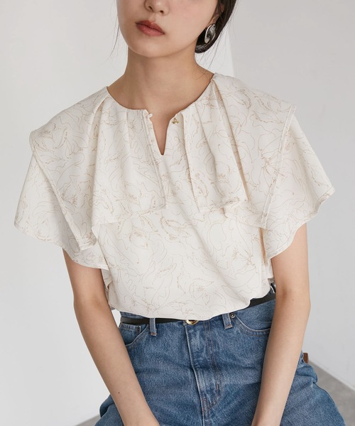 程よい甘さのあるラッフルフリルがポイントで肩や二の腕をカバーしつつ着映えするブラウス!◆2024-25 秋冬◆【デザイン・シルエット】顔回りを華やかにしてくれるラッフルブラウス。フリルではないので甘くなり過ぎず、大人の女性も着やすいデザインに仕上げています <POINT>・配色のパイピングでニュアンスカラーがより柔らかい女性らしいカラーリングにこなしてくれます 。・二の腕を気にしないで着用できるベストな袖丈。インでもアウトスタイルでもバランス良く着用いただけます。・どんなシーンでも活用できるきちん感がでる素材なので、一年を通して着用でき暑い時期でもしわになりずらくお手入れしやすい生地。 【素材】さらりとした落ち感のある生地は、着心地良く高見えするのも嬉しいポイント。気軽に洗濯機洗いも可能。 【カラー】 ホワイト・ベージュ系・花線柄・グレーの4色展開。 【おすすめのスタイリング】パンツ合わせで甘さを抑えたスタイリングがおすすめ。イン・アウトスタイルどちらも◎首元のボタンは開けて抜いてきていただいても表情が変わります。ボトムス次第でカジュアルにも、きちんと見えも叶う1着。 ----------------------------- 裏地:なし 光沢感:なし 透け感:あり 伸縮性:なし ボタン:あり(開閉可) 生地の厚さ:やや薄手 季節:夏、初秋 ----------------------------- 【モデル着用サイズ】 全色モデル身長:167cm、着用サイズ:F ※画像の商品はサンプルです。 実際の商品と仕様、加工、サイズが若干異なる場合がございます。 ※画像によっては実際の色味と異なる場合があります。正しい色味は生地アップ画像をご確認ください。