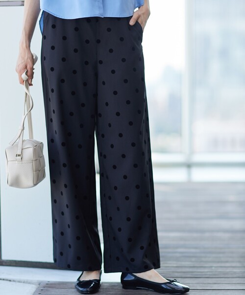 【デザインポイント】お腹周りがフィットするシルエットのワイドパンツです。すっきりと見えます。タックもなくウエストからフレアスカートのようにすっきり見えます。※ポケット数:横×2【スタイリングポイント】ワイドでもすっきりと見えるシルエットなのでトップスもオールマイティです。【素材ポイント】皺になりにくく、素材の上にフロッキーで水玉をプリントした素材です。※裏地なし※照明の関係により、実際よりも色味が違って見える場合があります。また、パソコン・スマートフォンなどの環境により、若干製品と画像のカラーが異なる場合もございます。モデル情報:身長168cm B76 W58 H86 着用サイズ:02(M)店舗へのお問い合わせ商品番号:F58-69004●製品寸法:01(S):W66~72cm H76cm 股下63cm 前股上32cm 渡り幅27cm 裾幅28cm02(M):W70~76cm H82cm 股下64cm 前股上32cm 渡り幅29cm 裾幅29cm03(L):W74~80cm H88cm 股下66cm 前股上33cm 渡り幅32cm 裾幅31cm備考:
