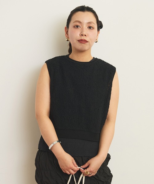 ポコポコとした素材の表情がユニークなベスト。モール特有のふっくらとした温かみを感じさせてくれる一枚です。部分的に光沢のあるコットンナイロン糸を使用しました。糸の良さが引き立つように、前はシンプルなデザインに。後ろのスリット、リボン仕様が特徴的です。ほどよい透け感があるためタンクトップやキャミソールなどのインナーと合わせて、晩夏からお楽しみいただけるアイテムです。また、Tシャツやブラウスなどと合わせることで長いシーズンで着ていただけます。------------------------------------------〔マックスニット〕 一緒にものづくりをする工場・マックスニットは新潟県の見附市(みつけ市)にあります。 実は新潟県は国内生産シェアが高く、繊維産業が盛んな県。 ”見附”という名前は水に浸かる土地という由来があり、豊かな水源近くにその工場はあります。 真面目さゆえに、普段なら気がつかない細部まできらりと光る技が。なんだか、「着心地いいなぁ」ってふと思う瞬間。みえないけれど、さりげないこだわりのつまったニット。毎日着たくなる、そんなお洋服。-------------------------------------------※こちらの商品はサンプルです。-----------------------透け感:あり裏地:なし伸縮性:ややあり光沢感:部分的にあり-----------------------【素材の特性・お取り扱いの注意】・この製品は、ニットの性質上、だれ易く、ハンガー掛けなどでの放置後、寸法・型などの安定性が乏しいので、ご了承下さい。また、編み組織上糸引きや引きつれが起こりやすいので、着用、着脱時には十分ご注意下さい。・ドライクリーニングは専門店で、セキユ系でお願いします。※取り扱い表示をよくご確認の上、着用をお願いいたします。※撮影画像は、光の当たり具合やモニターの環境により色味が違って見える場合があります。あらかじめご了承ください。※サンプル商品は実際の商品と仕様、加工、サイズが若干異なる場合がございます。