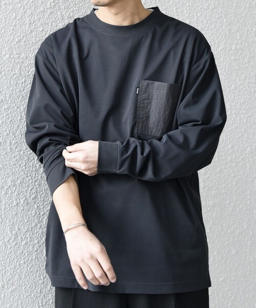 リップストップナイロンのポケットがポイントの撥水加工を施したロンT【素材特性】Teflon EcoElite(TM)(テフロンエコエリート(TM))というバイオベースの非ふっ素系防汚技術を施し撥水効果のある素材を使用。生地の通気性は維持しながらも多少の雨などで機能する素材です。【デザイン】左胸にリップストップナイロン素材をポケットにしたアクセントのあるリラックスフィットのロンT。ポケットのサイドにはさりげなくピスネームが付いているのがシンプル過ぎず◎1枚で着ても存在感があり、インナーとしても使いやすいです。ボトムスを選ばずに着用出来る、1枚持っていると重宝間違い無しのアイテムです!----------------------------裏地:無し光沢感:無し生地の厚み:普通伸縮性:有透け感:色により有水洗い:可能----------------------------【注意事項】※末永く愛用頂く為に、アテンションタグ・洗濯ネームを必ずご確認の上、着用又はお取り扱いください。※撮影環境による光の当たり具合やパソコン・スマートフォンなどの閲覧環境によって、実際の色味と異なって見える場合があります。 商品の色味は商品単体で撮影した画像をご参照ください。※生産状況により店舗にて販売する場合もございます。※画像の商品はサンプルです。 実際の商品と仕様、加工、サイズが若干異なる場合がございます。
