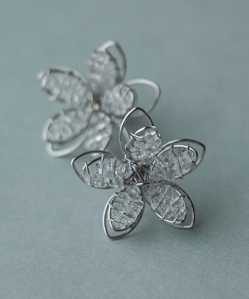 品のある華やかさと輝きを放つフラワーピアス。 繊細で透明感溢れるビジューが女性らしい耳元を演出します。 普段使いはもちろん、結婚式やパーティシーンにも活躍するアイテムです。 ※本商品は、パーツの配置・形・大きさ・色味に個体差があります。 ※ご使用のモニターまたは画面設定により、実際の商品と色味が異なって見える場合がございます。 ※入荷ごとに色味や仕様が変わる場合がございます。