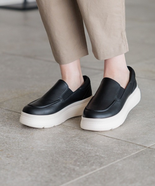 ーーー 厚底でスタイルアップできるスリッポンスニーカー 【素材】 甲材:合成皮革 底材:合成底 厚みはあるけど傾斜は少ない安定したソールを使用。 インソールやかかとクッションもボリュームがあり、軽量(当社比)なのでラクチンです。 スリッポンなので着脱もスムーズ! どんなテイストのコーディネートにもマッチするので、デイリー使いにピッタリです。 【機能】 ・消臭・抗菌防臭機能のあるテープをつま先裏地に使用 ・クッション性のあるインソールに使用し柔らかい足当たり ・かかとにクッションをつけており足当たりがやさしくホールド感がある履き心地 ・軽量な素材を使用し履き心地が良い〇(当社比) ーーー