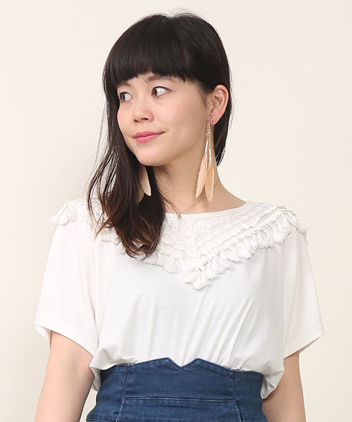 mystic(ミスティック) 肩から胸元にかけてV字に配したレース×フリンジ切り替えがアクセントのTシャツです。肌馴染みのいいカジュアルな着心地はそのままに、ゆったりとフレアさせたショートスリーブでフェミニンキュートなニュアンスを引き立てているのがポイント。装いにミックステイストを呼び込んでくれます。