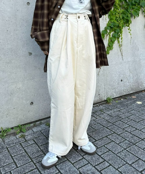 ウエストのフックで2段階の調整ができるユニセックスで履けるグルカパンツ●デザイン・ウエストに施されたフックで2段階にウエストサイズを調整ができます。・ウエストの後ろ部分にはゴムが入っているので、体型を選びにくい仕様となっております。・オーバーサイズのシャツやスウェットを合わせても◎・Tシャツやシャツをインしてきれいめなスタイリングでも◎・幅広く、さらに合わせるトップスで印象を変えられる万能パンツです。※左裾部分の内側に【SOUNDS GOOOOD / サウンズグッド】のタグが付いております。詳しくは詳細画像をご覧ください。●素材コーデュロイ:「オフホワイト」「ブラック」「ブラウン」デニム:「ダークインディゴブルー」「グレー」「サックスブルー」・・・・・・・・・・・・・・・・・・・・・・透け感:なし裏地:なし伸縮性:なし光沢感:なし生地の厚さ:普通・・・・・・・・・・・・・・・・・・・・・・●ウエストサイズ内側から1つ目のフックを使用した場合:74cm(最小)~内側から2つ目のフックを使用した場合:82cm(最小)~■お手入れ方法洗濯:液温は30 ℃を限度とし、洗濯機で非常に弱い処理が出来るアイロン:底面温度150 ℃を限度としてアイロン仕上げができるタンブル乾燥:不可__________________________________▼気になる商品を登録ハートをクリックして《お気に入り登録》がオススメです!セール情報や完売カラーの再入荷通知、ラスト1点の通知などを受け取ることができます!▼ブランド新商品や再入荷など、ブランド情報をいち早く受け取ることができます!※屋外の光や照明の当たり具合で、実際の商品の色味とカラー別画像の色味に若干の違いが発生する場合がございます。詳細画像と併せてご確認の上、ご注文いただきますようお願い致します。※画像の商品はサンプルです。実際の商品と仕様、加工、サイズ、素材が若干異なる場合がございます。__________________________________