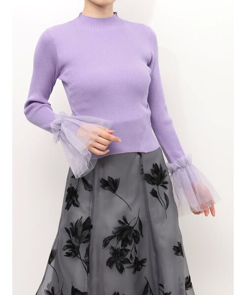2024 WINTER LOOK 着用アイテム >>こちらからCHECK<< 袖口にデコラティブなデザインを加えたニットです。 オフホワイトはレースと無地チュール、 ブラックはドットチュールと無地チュール、 パープルは配色使いにした無地チュール2枚をそれぞれ使用したアソートになっています。 袖口にポイントがあるので、身頃と袖は体にフィットするリブ編みになっています。 ※写真はすべてサンプルです。 ※衿はハイネックになります ※袖丈が3cm短くなります ▼スタイリング ハイウエストのマーメイドスカートやフレアスカートと合わせたり、 ジャンパースカートのインナーとして合わせるのもおすすめです。 ▼気になるアイテムはお気に入り登録がおすすめ 入荷情報やラスト1点、お得なプライスダウンの情報もいち早くお届け!