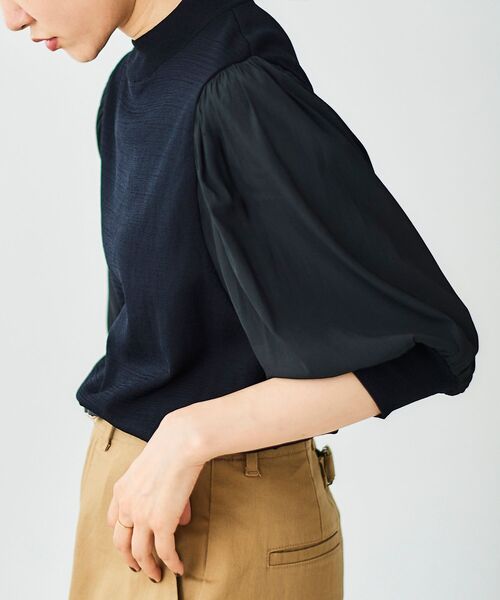 ニットの身頃に程よく光沢感のある生地の袖を組み合わせた異素材ドッキングプルオーバー。晩夏から秋の一枚着として着やすいシャリ感のある素材感、袖は今っぽくボリュームのあるデザインに仕上げました。 ●ポイント 幅広いシーズンで活躍してくれる、7分袖なのも魅力的な要素の一つになります。 バックスタイルは首元のビジューボタンがさりげなくポイント。 自信を持っておススメできる大活躍間違いなしのアイテムです。 ●おすすめコーデ スカートにもパンツにも合わせやすく、シンプルながらも華やかさのある1枚です。 二の腕の細見え効果は絶大!