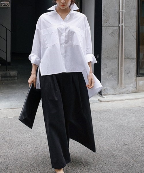 【 B'day / ビーデー 】アシンメトリー イレギュラーシャツトップス レディース イレギュラーシャツ シャツブラウス 白シャツ 袖あり 長袖 ドロップショルダー 襟付き フレア ワイド アシンメトリー 切り替え ポケット 前開き 大人可愛い きれいめ シンプル カジュアル 上品 お洒落 かっこいい 大人女子 こなれ感 ラフ ガーリー ルーズ 個性的 主役級 抜け感 無地 春 夏 秋 20代 30代 40代 ママ 通勤 通学 デート お出かけ 休日 旅行 着回し 普段使い 韓国系 楽ちん 体系カバー トレンド 流行 インスタ映え S M L XL ゆったり ホワイト