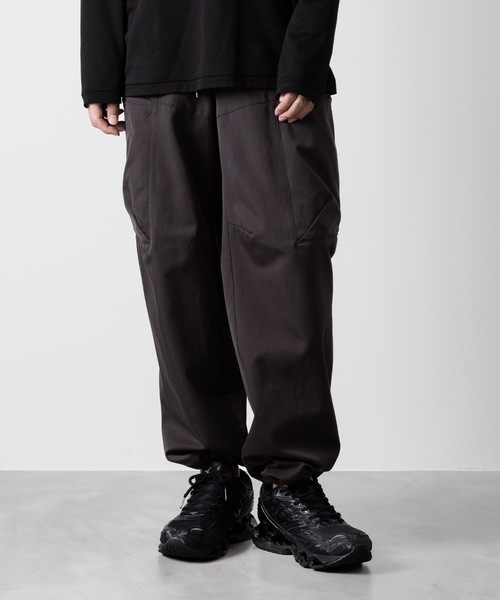 都会的な印象に仕上げられたイージーカーゴパンツ ■素材 上品な表面感に仕上げられたコットン・ナイロンツイルを使用。 高密度に織り上げることで、キメが細かくしなやかな素材に。 キレイめな印象を持ちつつも、ツイル織りにすることで、タフでシワになりにくくデイリーに着回しやすい素材に。 ■デザイン ATTACHMENTらいしミニマルなデザインのワイドカーゴトラウザーズ。 ヒップからワタリにかけてゆったりとしたリラックス感のあるシルエット。 そこから裾に向けてストンと落としたワイドストレート。 両サイドにはZIP付きの大きなカーゴポケットが付き、ボリューム感のあるシルエットが楽しめます。 ウエストベルト後ろ半分はゴム仕様のイージータイプでリラックス感の高い穿き心地が魅力です。 また、裾にはスピンドルが内蔵されており、気分やスタイリングに合わせて裾幅を調整可能。 【ATTACHMENT / アタッチメント】 99年に熊谷和幸によって”ATTACHMENT”を設立。 服を、着る人の魅力や個性、内面を引き出す“付属”として捉え、 シルエットの計算と、素材使いから生まれる着心地の良さ、 クラフツマンシップが叶える緻密な仕立て、 ディテールをそぎ落としたシンプルで普遍性のあるウェアを提案しています。