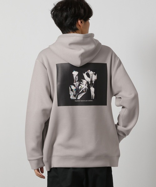 大きく入ったバックプリントが目を引くフーディー。フラワーモチーフでカラーによって柄が異なります。フロントの胸元にもロゴがカラー別で入っていて前も後ろもアクセントになっています。ゆったりとしたシルエットでリラックス感のある着こなしができます。【素材】柔らかく肌触りも良い質感。中肉の厚みなので、一枚着でもアウターのインナーとしても着やすく活躍の場が広いです。【スタイリング】カジュアルなスタイルはもちろん、キレイ目スタイルのハズしとしても。女性が大きめに着るのもおすすめ。