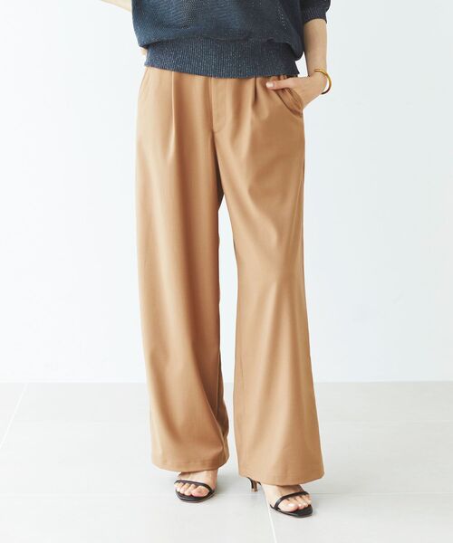 《人気のサイドベルトパンツがサイドの付属を変えて登場!》前回同様にストレッチギャバを使用したタックワイドパンツ。程よい落ち感と伸縮性があるのですっきりときれいに穿いて頂けます。●ポイントサイドは親子Dカンで、ウエストが大きい方は多少調整可能。腰回りはすっきりとしたややワイドシルエットで、後ろ中央はゴムを使用しているので履き心地も◎●おすすめコーデショート丈のトップスやフロントINスタイルの着こなしが◎カジュアルからキレイめまで汎用性の高いアイテムです。【スタッフ着用コメント】〈スタッフA〉40代前半/152cm/骨格ウェーブ/普段サイズS‐M/着用サイズ36サイズ感:サイドバックルでウエストを調整可能。バックゴムでストレスフリー。丈短めのワイドパンツです。素材感: サラッとした素材ながら、軽すぎないので晩夏から冬アウターを着る時期でも早めから着用出来ます。着用感:昨年も大好評の名品。サイドバックルにゴールドを使用し、ウエストインスタイルもオシャ見えします。様々なコーディネートに対応し、万能な一本です。〈スタッフB〉40代/163cm/骨格ウェーブ/普段サイズ38/着用サイズ38サイズ感:腰周りはバックルで調節可能。程よいワイドなサイズ感です。素材感: 柔らかく履き心地よいです。着用感:きれいめでも、カジュアルでも合わせやすいボトムスです。