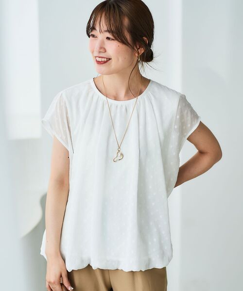 トレンドのバルーンデザインを用いた程よいシアー感が魅力のドットジャガードのバルーンブラウス。内側にはカットソー素材を使用しているので肌なじみも◎●ポイント気になる二の腕もカバーしてくれる袖丈も嬉しいポイントです。シアー感がありながらもドット柄が上品な1枚。裾に施されたバルーンデザインがふわっとしたシルエットを演出。●おすすめコーデジャケットのインナーとしても◎ボトムは細身パンツできれいめに、ワイドパンツでカジュアルに、オンオフ着回すことができるブラウスです。