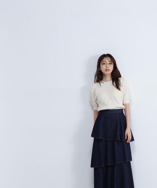 <お出かけ・デイリーにおすすめ>カジュアルかつフェミニンなディテールのティアードスカート。アシンメトリーな切り替えを入れたフレアが華やかな印象に見せてくれます。ボリューム感があるシルエットなので、肌見せニットやコンパクトなニットトップスと合わせるのがおすすめです。<素材>落ち感のある中肉のデニム素材を使用。<詳細>仕様・左ファスナー裏地・なし透け感・ややあり / 光沢・なし / 伸縮性・なし生地の厚さ・普通デニム製品は摩擦により色移りする可能性がございます。白や淡色系衣料品や雑貨などご着用の際は十分にご注意ください。※モデルの着用画像の場合、光の当たり具合により、実際の色味と異なって見えることがございます。色味は、商品単体の画像をご参照ください。※ウエスト切り替え位置下から裾までのスカート丈は86cmになります【ZOZOでのお買い物をもっと楽しむために!】■ブランド・ショップのお気に入り登録・いち早く新作アイテムや限定クーポンなどのお得な情報を受け取ることができます!■商品のお気に入り登録・完売商品の再入荷通知や、残り1点の通知、各種セール通知も受け取ることができ、よりお得にお買い物頂けるチャンスがあります!