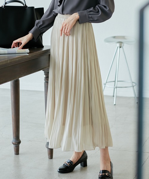 自分にあった着丈が選べる!人気シリーズのプリーツスカート。自分好みのサイズを選べる、人気の着丈が選べるシリーズ。 38サイズは38Tサイズより着丈が15cm短い(着丈以外は同じサイズ)。 : 【素材感】 ・優しくきらめくシアー素材。 【デザイン・シルエット】 ・ウエストシャーリングで穿き心地の良いプリーツスカート。 ・細やかなプリーツは裾に向かって自然に消えるデザインで、広がりすぎないシルエットバランスに。 ・ウエストベルトは、着用時にベルトのプリーツがなくならないよう分量を入れ、トップスインしても綺麗に見えるようこだわった作り。 【カラー】 ・ダークブラウン、ベージュ、サックスブルーの落ち着いた3色展開。 ・ダークブラウン(20)はチャコールグレーのような色味になります。 【スタイリングポイント】 ・トップスやシューズを変えればオールシーズン着用可能。 ・秋冬は毛足のある暖かなニットとブーツを合わせて。 ・初秋は軽いTシャツやカットソー合わせでOK。 ----------------------------- 裏地:あり 透け感:裏地がついていないところはあり 伸縮性:なし 生地感・厚さ:やや薄手 ポケット:なし その他仕様:ウエストゴム 季節:通年 ----------------------------- ※撮影時の光、お使いのモニター環境によって色の見え方が違う場合がございます。 ※モデル身長:165cm 着用サイズ:38/38T