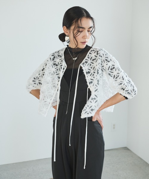 ”ドレスシーンにも活躍するオーガンジーボレロ”繊細な印象のオーガンジーレースとモノトーンでも華やかさのあるフラワーモチーフ。フワッとしたフォルムとショート丈が絶妙なバランス。前後2WAY仕様でボレロ/ショートトップスとしても着用していただけます。同素材の"オーガンジーフラワーシャーリングビスチェ"とアンサンブルとしても着用可能です。【SNS動画掲載アイテム】@aic_official上記の公式インスタグラムアカウントにて着回し動画を掲載しております。是非ご覧くださいませ。★お取り扱い注意事項★下記をご確認いただきご了承の上、ご購入ください。・こちらの商品はデザインを重視したデリケートな素材を使用しているため、引っ掛かりなどで糸がつりやすくなっております。・着用中の摩擦などにより、ピリング(毛玉)が生じる場合があります。・洗濯の際は色落ちしますので単独で洗い、湿気を含んだ状態や水につけたままで放置しないでください。・濃色の製品は、摩擦や汗、雨などで濡れると、ほかの衣料に色移りする場合がございますので、充分ご注意ください。・商品の写真はサンプル品を撮影している為、実際の商品とは仕様や加工、加工によるダメージ、サイズ等が若干異なる場合もございます。・初回販売分と生産時期の異なる商品は、色味や加工等若干異なる場合がございます。・システムの都合上下げ札の税込み価格表記が商品ページの税込み価格と1円ずれている場合がございます。・掲載画像の商品の色味は、屋外や屋内の光の照射や角度により実物と色味が異なる場合がございます。また表示のサイズ感と実物は若干異なる場合もございますので、 ・着用、お取り扱いの際は、商品についている品質表示とアテンションタグを必ずご確認下さい。