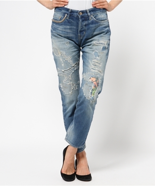 『ベーシックとは違う最旬として楽しめるデニムパンツ』 腰回りに余裕があり、ひざ下を絞ったアンクル丈のデニムパンツ。 ゆったり大きめに履きこなすのが今シーズンのトレンドです。 ■PHOTO PATCH REMAKE加工 膝から腿にかけてダメージ加工を施し、ダメージ箇所にはデニムを裏表使い分けて使用し、通常のステッチと千鳥ステッチでリペアを施した後、更にハードな加工とそれを補強するリメイクを施して仕上げています。 二度の加工により、最初のリメイク時のステッチ切れや独特の色落ち感を再現しています。 大きく空いた左ひざの当て布にはHYSTERIC GIRLの写真をコラージュしたプリントをのせ、ポップさを強調しました。 ■12.5oz OLD BLUEセルビッチデニム シルケット加工 60年代をイメージしたOLD BLUEの染めムラ形状をを再現したタテ糸を使用し、シャトル織機で右綾(3/1)に織り上げ、最後に生地の毛羽感を抑える仕上げ加工を施したオリジナルデニムです。