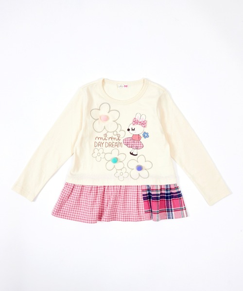 裾のビエラチェック地の切り替えがポイントの天竺素材の長袖Tシャツ。前身頃いっぱいに広がったうさぎのmimiちゃんのアップリケとお花のプリントがかわいらしいデザインです。お花の真ん中のカラフルなぼん天がキュート♪80-90cmは左肩開き仕様です。●生地の厚さ:普通●裏地:なし●ポケット:なし●伸縮性:あり●透け感:なし