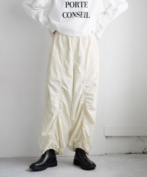 ■デザイン■ナイロン生地にワッシャー加工を施して、柔らかで表面感のある穿きやすい素材感に仕上げたデザインカーゴパンツ。フロントや脇にギャザーを施し立体的に仕上げているのでシンプルなスタイリングでも着映えします。裾はドロスト仕様なのでお好きなシルエットにアレンジ可能。ウエストはイージー仕様で楽に着用できるのもポイントです。■スタイリング■コンパクトなTシャツと合わせたスタイリングがオススメ。ビスチェなど甘さのあるアイテムとも相性良く着用いただけます。いつものカーゴパンツとはまた違った雰囲気を楽しめるアイテムです。