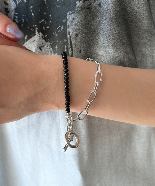 【MODEなスタイリングにぴったりなブレスレット】黒のストーンとチェーンの重ね付け風なデティールでMODEでシックなコーデにぴったり。■detail・チェーン&ストーン・マンテル留め・アジャスター付き【商品画像について】※画像はサンプルです。実際の商品と仕様、加工、サイズ、カラーが若干異なる場合がございます。また、撮影場所や照明の照射・角度、お使いのモニター環境によりお色味が異なる場合がございます。予めご了承ください。【Figments/フィグメンツ】ファッション、音楽、カルチャー。時代とともに変化を楽しむ者たちに向けた、Realityを覆し、常識を壊すユニセックスファッションブランド。《お気に入り登録》・「商品のお気に入り登録」で再入荷通知や、ラスト1点の通知、セール通知も受け取ることができます。・「ブランドのお気に入り登録」で新商品や再入荷など、いち早くブランドのお得な情報を受け取ることができます。