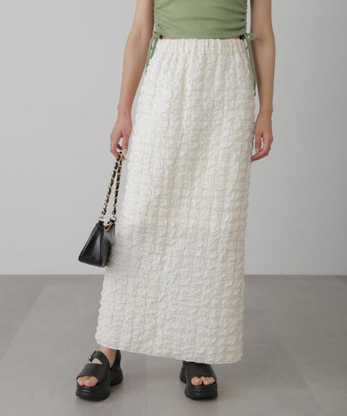 〔fabric&design〕ぽこぽことシボ感がある生地にキルティングを施した凸凹のある表情が特徴のスカート。生地に特徴があるので、形はあえてシンプルにナロースカートにしています。ウエストゴム仕様でリラックス感があり、生地の凸凹に反して着太りせず、身体のラインを拾わない絶妙なサイズ感。〔styling〕合わせていただくトップスによりカジュアルスタイルにもフェミニンスタイルにも万能に活躍してくれます。ショート丈のトップス合わせがバランスが取りやすく、スタイルアップして魅せてくれます。■透け感:なし■生地の厚さ:普通■裏地:あり■伸縮性:ややあり■光沢:ややあり■シルエット:スタンダード---------------------------------------------------◆商品のお気に入り登録◆お気に入りアイテムの値下げ・再入荷・在庫1点などの通知を受け取ることができます。◆ブランドのお気に入り登録◆新商品や再入荷、セール、クーポン配布などお得な情報を受け取ることができます。---------------------------------------------------