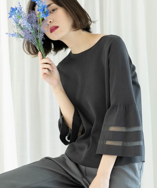 上品なフレアスリーブデザインに、シアーデザインでトレンド感をプラスしたニットプルオーバー 【デザイン】 ・フレアに広がるお袖が上品なデザイン ・フレアスリーブ部分にシアー編みでボーダーデザインを取り入れて、トレンド感のある一枚に。 ・身頃は程よい厚みのある総針編みで、身体のラインを拾いすぎずすっきりとしたシルエット。 ・ジャストな着丈で、イン・アウトどちらのスタイルも楽しめます。 【素材】 ・さらりとした肌触りで、きれいめに着こなしていただける合繊素材を使用。 ・ハイゲージの糸を使用して編みたてており、きれいな目面がポイント。 ・マシンウォッシャブル、アンチピリングでお手入れも簡単です。 ・UVケア機能 ※この製品は、太陽光線中の紫外線(UV)を通しにくくします。この効果は永久的ではありません。 ※照明の関係により、実際よりも色味が違って見える場合があります。また、パソコン・スマートフォンなどの環境により、若干製品と画像のカラーが異なる場合もございます。 モデル情報:身長166cm B72 W62 H86 着用サイズ:38(M) 店舗へのお問い合わせ商品番号:637-19035 ●製品寸法: 38(M):着丈56cm B96cm 袖丈46cm 肩幅33cm 40(L):着丈58cm B100cm 袖丈47cm 肩幅35cm 42(LL):着丈60cm B104cm 袖丈48cm 肩幅37cm 備考: