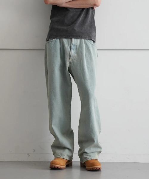 COLOR DENIM 1 TUCK PANTS (カラー デニム 1 タックパンツ) F-LAGSTUF-F (フラグスタフ) 「F-LAGSTUF-F(フラグスタフ)」のブランド名はLAG(国、国旗)STUFF(物etc)をつけた造語。 2014年に「何にもとらわれないボーダレスな物づくり(Impartial to Everything)をコンセプトに活動をスタート。 DESIGNER : 村山 靖行 原宿にあるヴィンテージショップのバイヤーとして活躍したのち、2014年F-LAGSTUF-F(フラグスタフ)をスタート。 音楽やストリートカルチャーを背景にクリエイションを展開する。