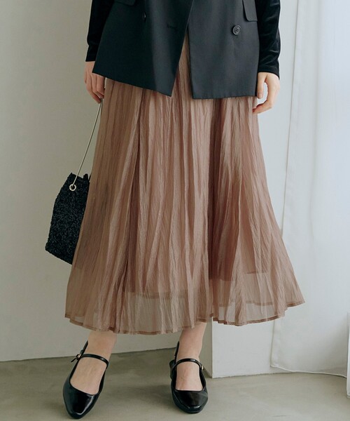 存在感がありながらも着回しの効く優秀スカート 【デザイン】 繊細なオーガンジー素材にシワプリーツ加工を施したマキシ丈スカート。 コーディネートに軽さを与えて、スタイリングを格上げしてくれる1枚です。 大人かわいい上品な透け感が魅力。 一度アコーディオンプリーツをかけたあとにシワ加工をさらに加える、工程数の多いプリーツ加工を施しています。 ほどよくラフな表情がエレガントになりすぎず、きれいめにもカジュアルにも活躍します。 (※シワ加工は手仕事で行っている為、個体差が生じます。) 着脱がラクなウエストゴム仕様も嬉しいポイント。 グログランテープでゴムをくるんだデザインで、ウエストが見える着こなしでも上品に決まります。 存在感がありながらも着回しの効くシンプルなデザインなので、幅広いコーデに取り入れられる優秀アイテムです。 ※ポケットなし 【素材】 ポリエステル/ナイロンのオーガンジー素材を使用。 程よく柔らかな風合いの素材で、ハリ感がですぎず程よいボリュームを作り出します。 ナイロンを交織することで柔らかい光沢感になり、オーガンジー特有のギラつきがなく、コーディネートに馴染みやすい素材です。 ※裏地あり ※裏地のない部分は透け感があります。 【スタイリング】 秋にはジレやジャケットなど重厚感あるアイテムとの外しコーデにおすすめです。 ざっくりとしたニットとの合わせも、素材感の対比が際立ち素敵です。 夏にはTシャツ合わせでも華やかに決まりますし、春にはコートスタイルの抜け感出しにと、シーズンレスに活躍する優秀アイテムです。 ※照明の関係により、実際よりも色味が違って見える場合があります。また、パソコン・スマートフォンなどの環境により、若干製品と画像のカラーが異なる場合もございます。 【24AW】 モデル情報:身長166cm B80 W59 H86 着用サイズ:02(M) 店舗へのお問い合わせ商品番号:768-79014 ●製品寸法: 01(S):W65~89cm 裾幅134cm 総丈87cm 02(M):W68~92cm 裾幅137cm 総丈89cm 03(L):W71~95cm 裾幅140cm 総丈91cm 04(LL):W74~98cm 裾幅143cm 総丈93cm 05(3L):W77~101cm 裾幅146cm 総丈95cm 備考: